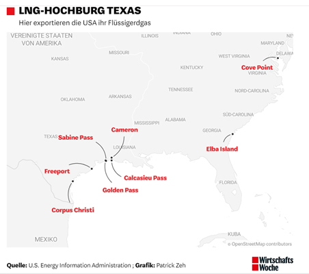 Sechs der acht Exportstätten in den USA liegen am Golf von Mexiko - in Texas und Louisiana.