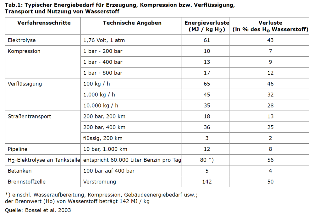 ▶ Ulf Bossel: Saubere Energie aus Wasserstoff ist Illusion Nach Meinung von Ulf Bossel vom Europäischen Brennstoffzellenforum ist Wasserstoff ein denkbar ungeeigneter Energieträger, da bei seiner Herstellung viel Energie verbraucht und bei Transport und Lagerung viel Energie verloren gehe. Angesichts der schlechten Energiebilanz werde "auch niemand so dumm sein, um hier in eine Wasserstoffinfrastruktur zu investieren". |