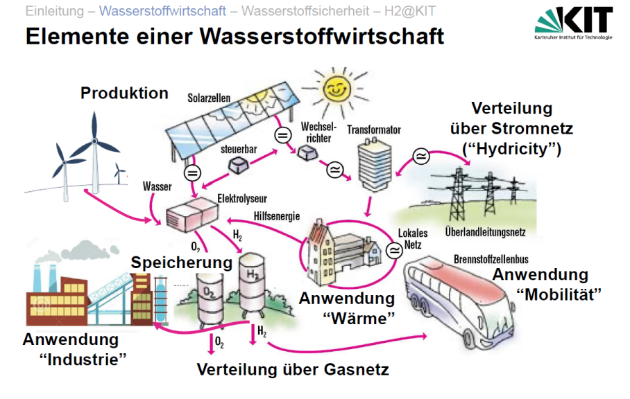 In Zukunft soll der Wasserstoff durch Elektrolyse mit Strom aus Photovoltaik- und Windkraftanlagen gewonnen werden.