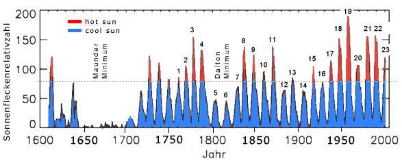 50 x 50 Pixel Die Zahl der Sonnenflecken schwankt in einem regelmässigen Zyklus von etwa 11 Jahren welche in Gruppen auftreten (Gleissberg-Zyklen: 80-90 Jahre).