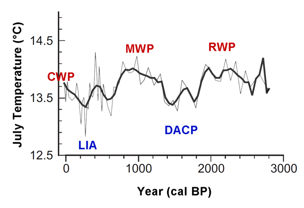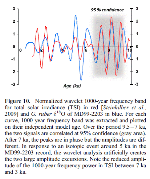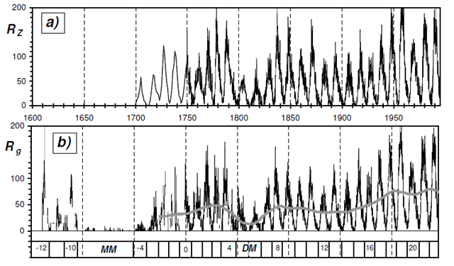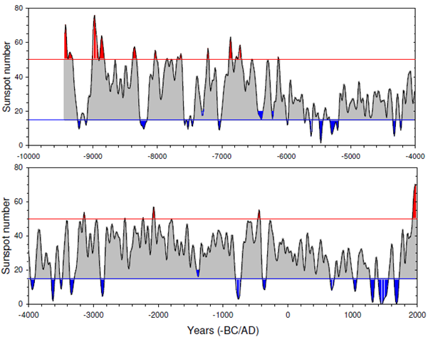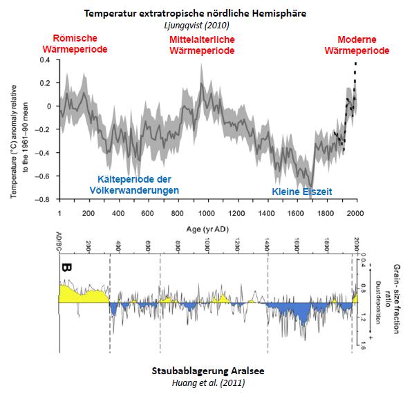 Die Studie zeigt zweierlei Dinge: Zum einen passt die Klimaentwicklung der letzten Jahrzehnte am Aralsee sehr gut in das natürliche Muster der vergangenen 2000 Jahre. Die industrielle Phase seit 1850 stellt keineswegs eine noch nie dagewesene klimatische Sondersituation dar, wie einige IPCC-Wissenschaftler gebetsmühlenartig der Presse gegenüber wiederholen. Zum anderen zeigt die Studie, dass das Klimageschehen am Aralsee der solargetriebenen Millenniumszyklik gehorcht. Offensichtlich sind auch die Schwankungen der Staubablagerungen am Aralsee eng an die Entwicklung der Sonnenaktivität gekoppelt. |