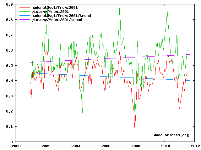 | → | HadCRUT temps have been declining since the start of the current millennium, but Hansen continues to show an increase | |